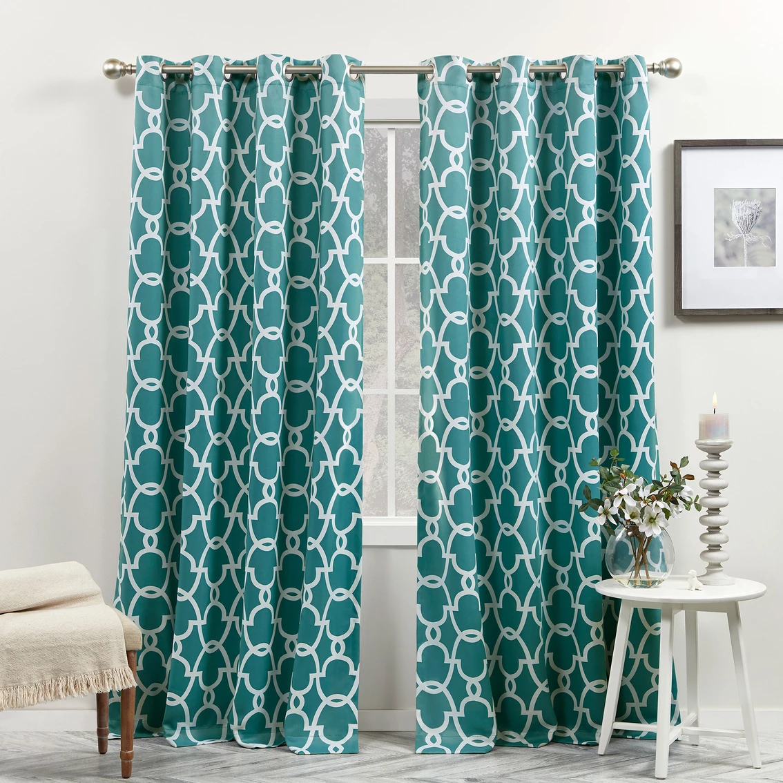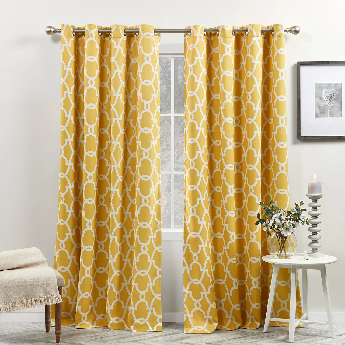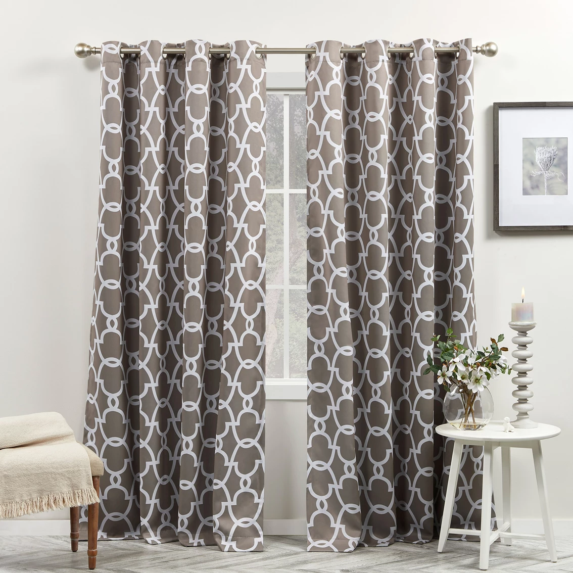 The Gates printed woven blackout thermal insulated grommet top window curtain panels from Exclusive Home provide a modern elegant look to any room in your home. The design with its visually clean lines and geometric style adds a contemporary look and is printed on a lush polyester fabric that feels rich as well. These woven panels drape beautifully and are interwoven with room darkening blackout insulation provided by LightBlock and Thermax technology. These panels will block light, prevent harmful UV rays from reaching your floors and furniture, efficiently prevents cold or heat transfer from outside, will increase energy efficiency of your home, provide unparalleled privacy, and allow you to create darkness at any time of day. Perfect drapery option for anyone seeking to block daylight, take a nap, or keep sun glare off your TV. The Gates drapery is constructed with gorgeous, matte silver grommets and can be hung on your favorite curtain rod up to 1.25-in. diameter, adding yet another touch to the richness and luxury of your decor. These window curtain panels will drape beautifully from any window that could use that perfect, finishing touch. The curtain panels are perfect for any living room, bedroom, family room, dining room, bathroom and office. The stylish designs will suit any window space. Model: EH8023-02 2-84G.