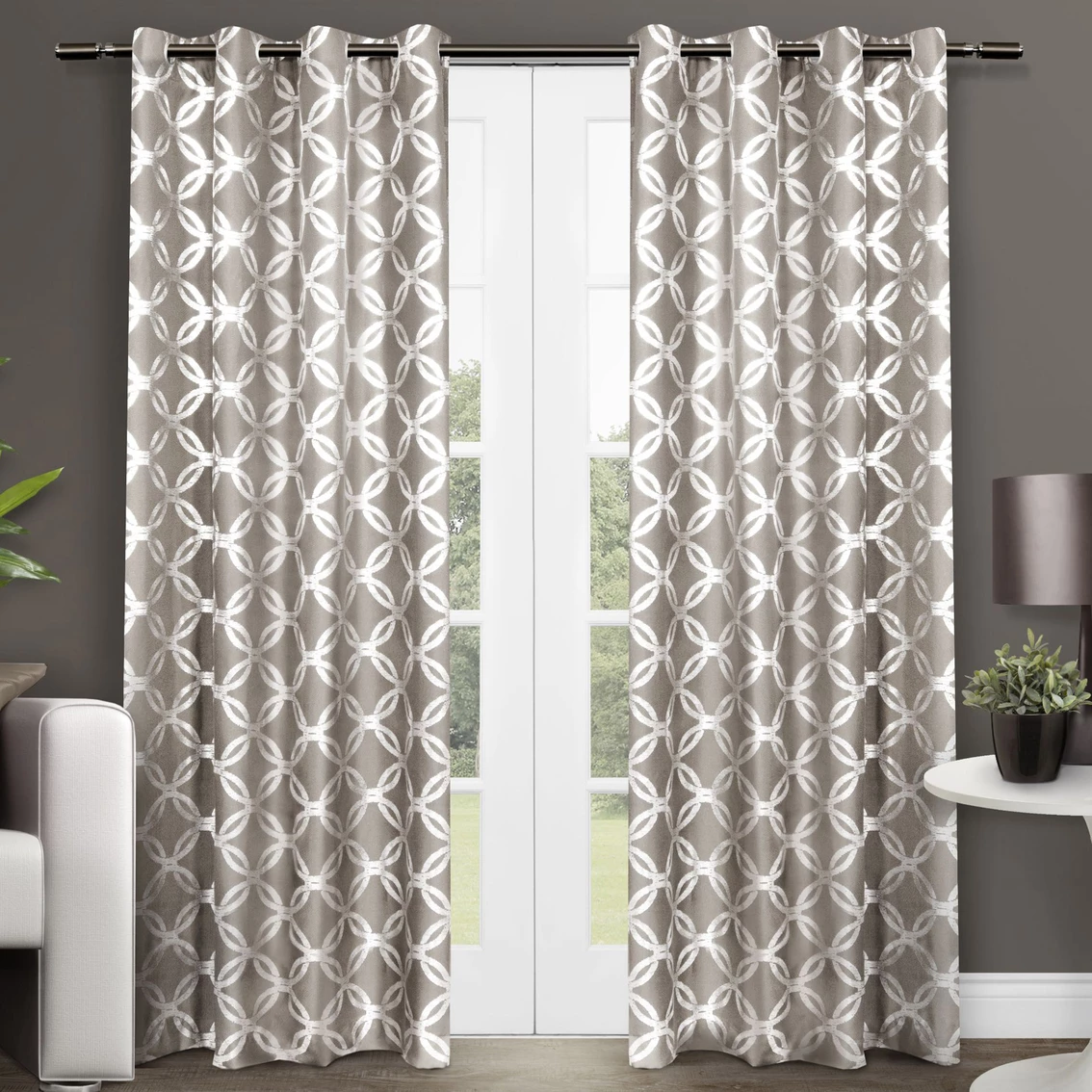 Made of a luxurious textured linen look jacquard fabric, the Modo grommet top window curtain panels from Exclusive Home are simple yet sophisticated and are sure to add a rich warm look to any room. The metallic interlocking circular design provide a beautiful sheen adding depth and grace to your home. These simple yet sophisticated window curtain panels add a rich warm look to any room. The metallic interlocking circular design provides a beautiful sheen, adding depth and grace to your home. The Modo drapery is constructed with gorgeous, matte silver grommets and can be hung on your favorite curtain rod up to 1.25 in. in diameter, adding yet another touch to the richness and luxury of your decor. These window curtain panels will drape beautifully from any window that could use that perfect, finishing touch. They are perfect for any living room, bedroom, family room, dining room, bathroom and office and will suit any window space. Includes two curtain panels. Model: EH8182.