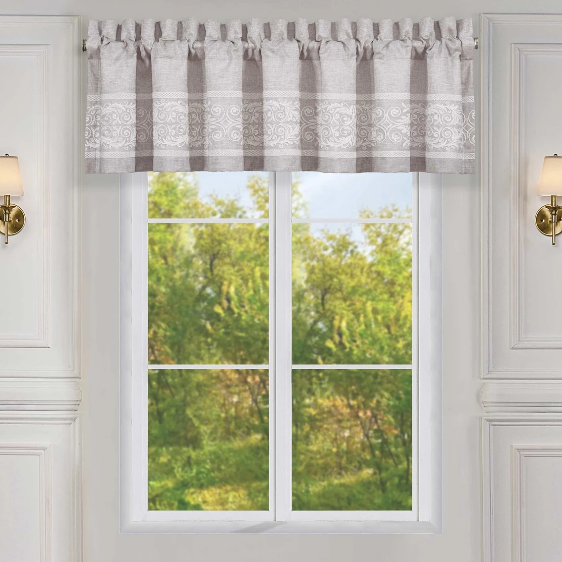 The Maryanne Straight Valance is exquisite with its fine details and sophisticated use of beige and cream colors. This beautiful valance features a transitional, ornate scroll embroidered design on top of a beige faux linen. The 3″ header and 3″ rod pocket make this valance easy to hang. Pair this valance with the Maryanne window panels and bedding set by Five Queens Court for a complete look.