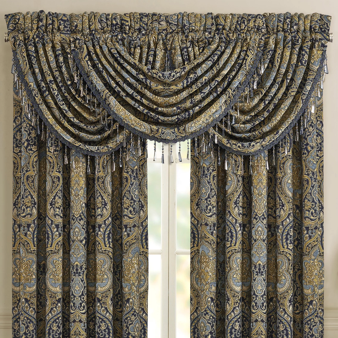 Create a custom look on your window with this Five Queens Court Palmer Teal Window Waterfall Valance made of the same woven chenille damask fabric as the panels. Valance is trimmed with a crystal tassel fringe. In order to achieve the look in the photo, use three valances. Includes one 33 x 43 in. valance. Style: 2357026WTRSW.