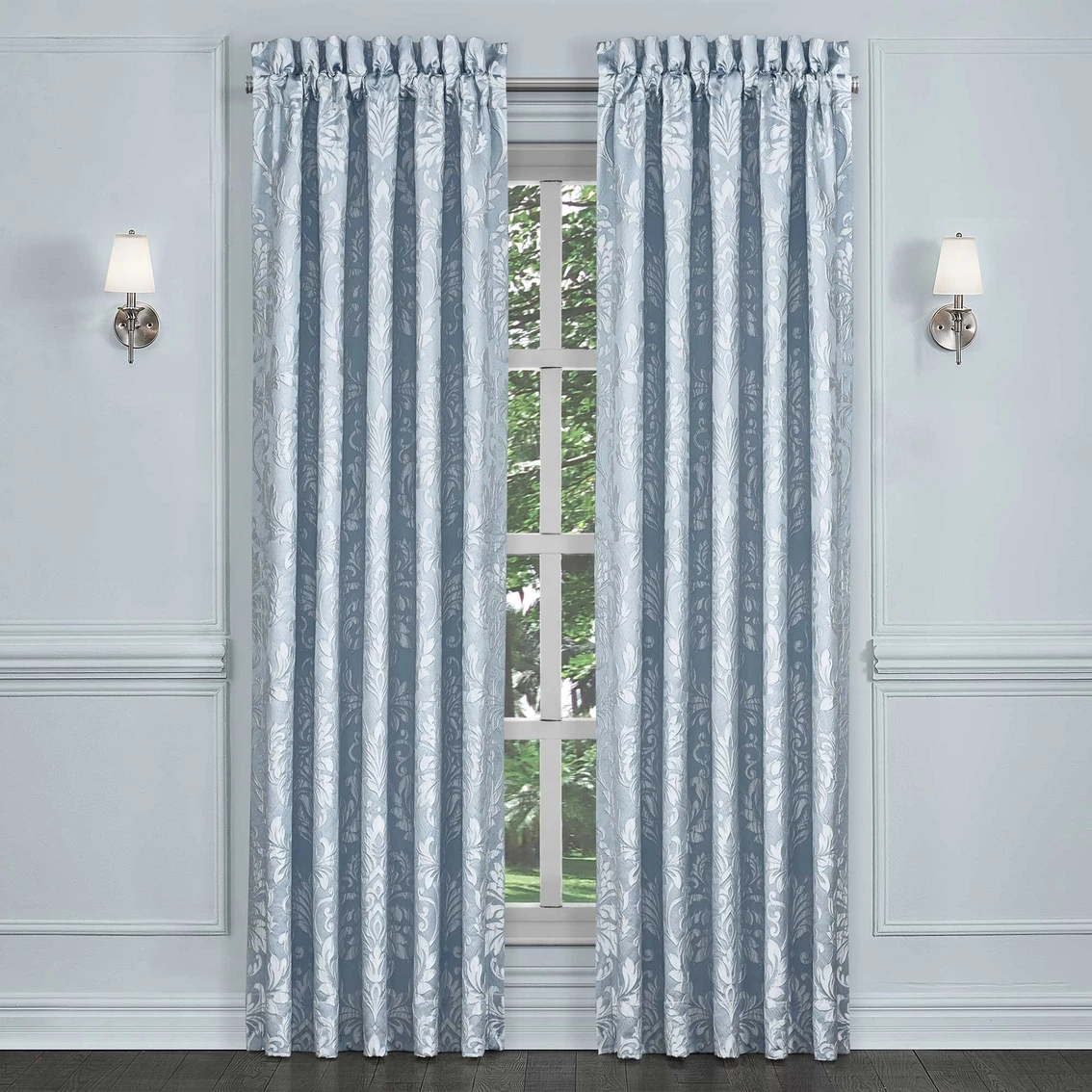 The J. Queen New York Malita drapery panels add an elegant decorator touch to your windows. The powder blue panels are cut and sewn with a grand damask woven jacquard pattern. Each panel is cut by the same staring point to insure all panels match when hung side by side. The 3-inch header and 3-inch rod pockets make these easy to setup and they are lined with a solid white lining to keep your room cool and comfortable. The Malita Window Valance is sold separately. Includes two 84-inch window panel pair and two tiebacks. Style: 265412384PR.