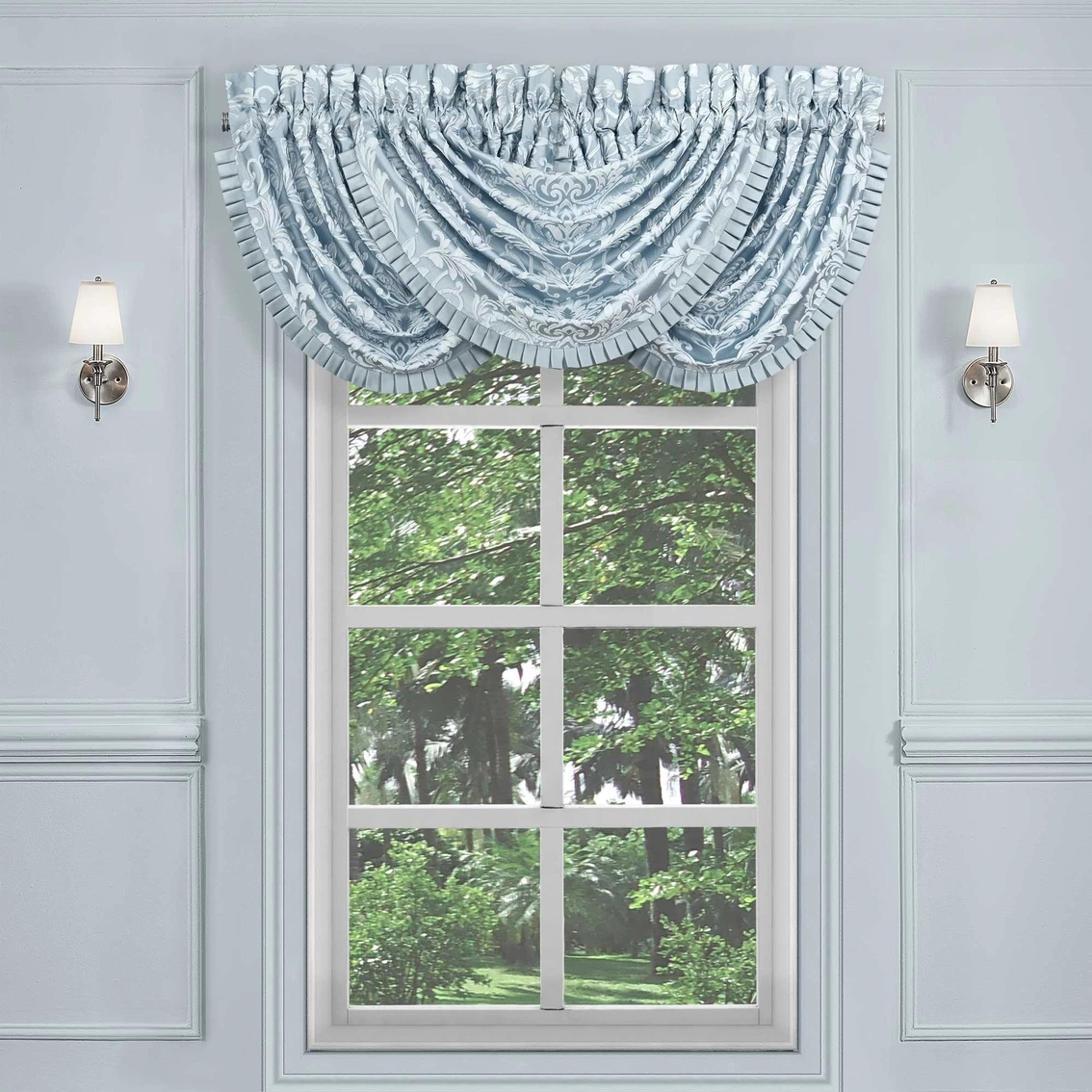 Designed for the ultimate look of luxury, the J. Queen New York Malita Waterfall Valance uses a grand woven jacquard damask fabric that is trimmed with a pleated satin flange. The powder blue tones are soft yet elegant and they are lined for insulation and constructed with a 3-inch header with a 3-inch rod pocket for easy setup. Style: 2654123WTRSW.