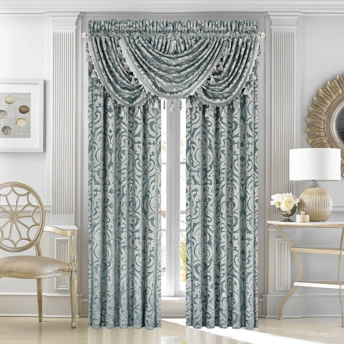J. Queen New York Sicily Teal 84 in. Window Panel Pair. These elegant chenille woven oversized Damask Window Panels Pairs by J. Queen New York are custom cut, have an opaque white lining and include coordinating tiebacks. Model: 206502684PR.