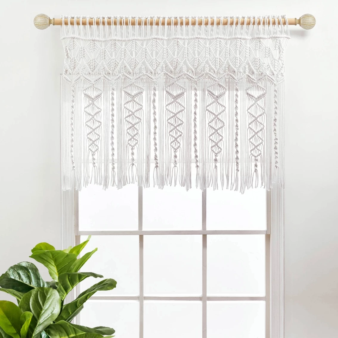Create a boho look in multiple rooms of your home with this multi-functional decorative piece. The macrame is knotted and woven by hand to create textured geometric patterns. Use as a kitchen window curtain, valance, or wall art. Measures 40″W x 30″L.