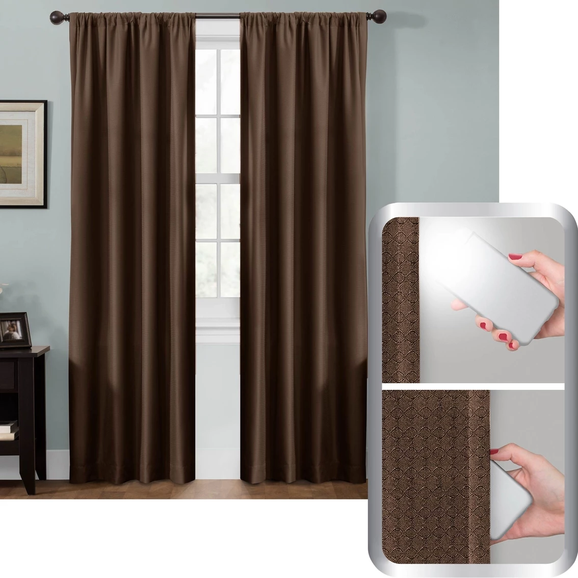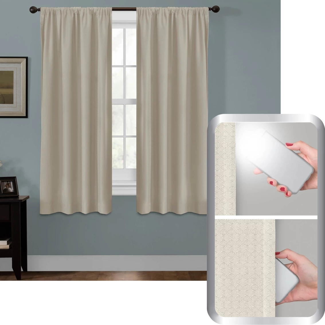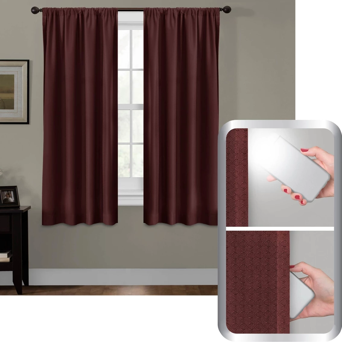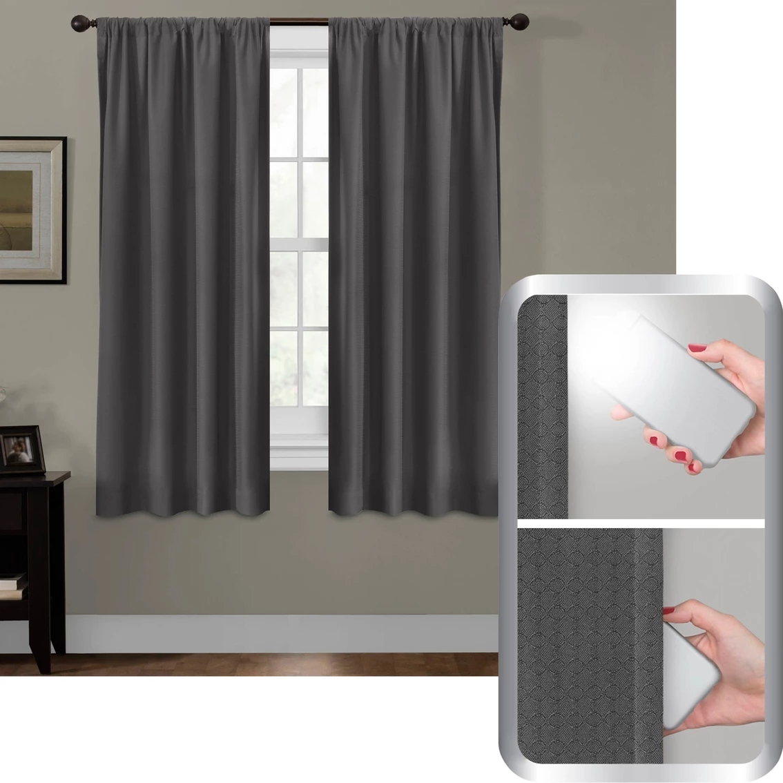 The Maytex Smart Curtains Ultimate Light Blocker Julius 100% Blackout Window Panel, 50 x 63 in., will transform day into night in your living room, bedroom, nursery or any room in your home where you want to prevent light from entering. Besides being certified to block out 100% of light, these window panels will help save energy costs and reduce noise. With an elegant jacquard geometric pattern on solid fabric, these panels will instantly refresh your room decor, too. Their rod pocket construction makes for easy installation in standard window openings. One panel is included per package. (For window widths up to 33 inches, use one panel; for widths from 34 to 66 inches, use two panels; see size chart for larger widths.) Model: 5321.