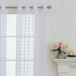The Neo sheer grommet top panel from Natco Home features a clipped applique design that adds a unique element of texture and dimension. It;s made of 100% polyester for easy care. Features light filtering for soft diffused light penetration. Panel is fade resistant. The grommet top allows for easy installation. Install on up to a 1-in. curtain or decorative rod. Machine wash cold gentle cycle, wash with like colors, use mild detergent, do not bleach, tumble dry low, cool iron if needed. Each panel sold separately. Model: MC00X82500184.