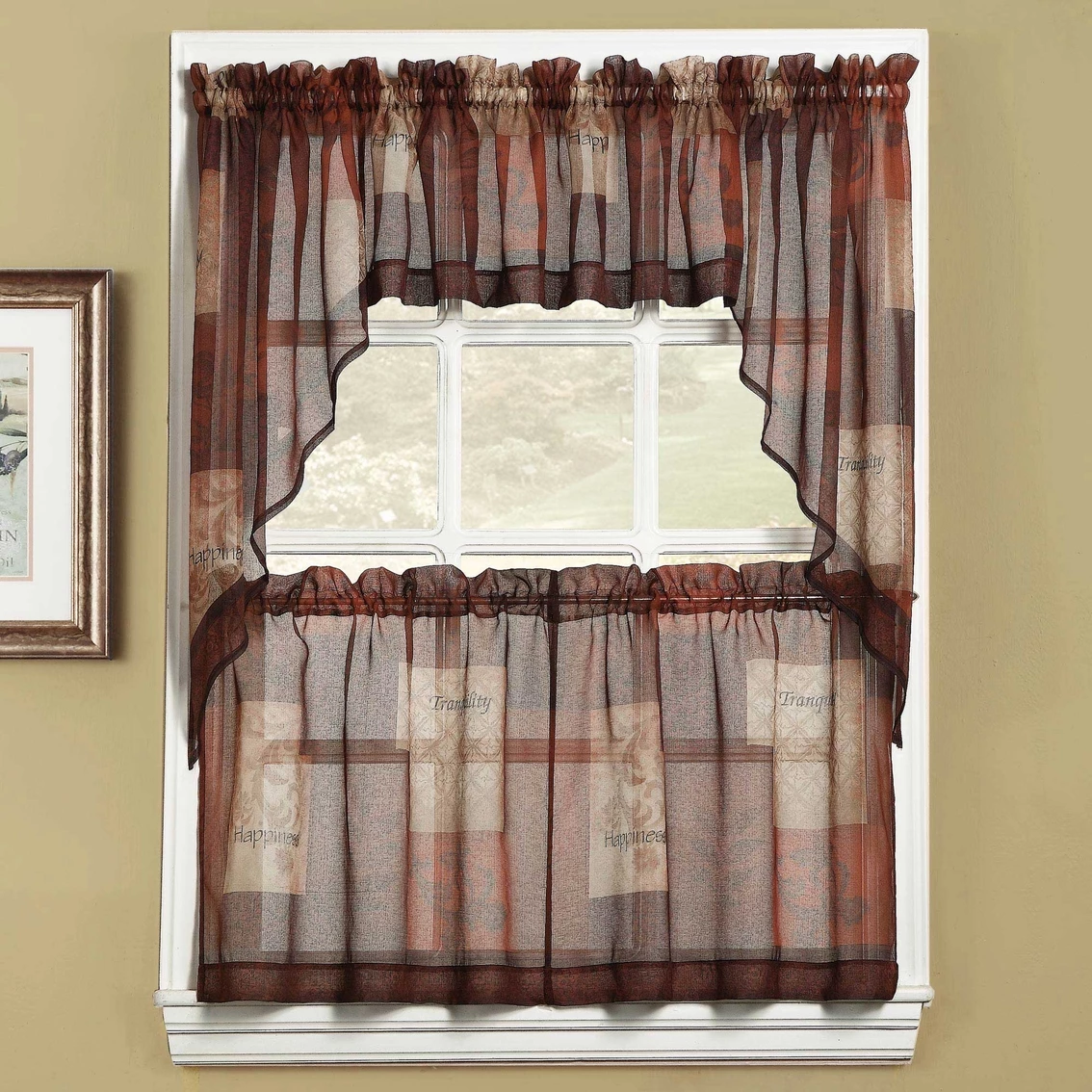 This charming pair of tier curtains features a longer length to create a right-sized window look. With inspiring words like happiness and tranquility, Eden kitchen curtains feature beautiful earthy colors. Crafted from a sheer voile fabric, the Eden window treatment is versatile for use in the kitchen, dining or living spaces.