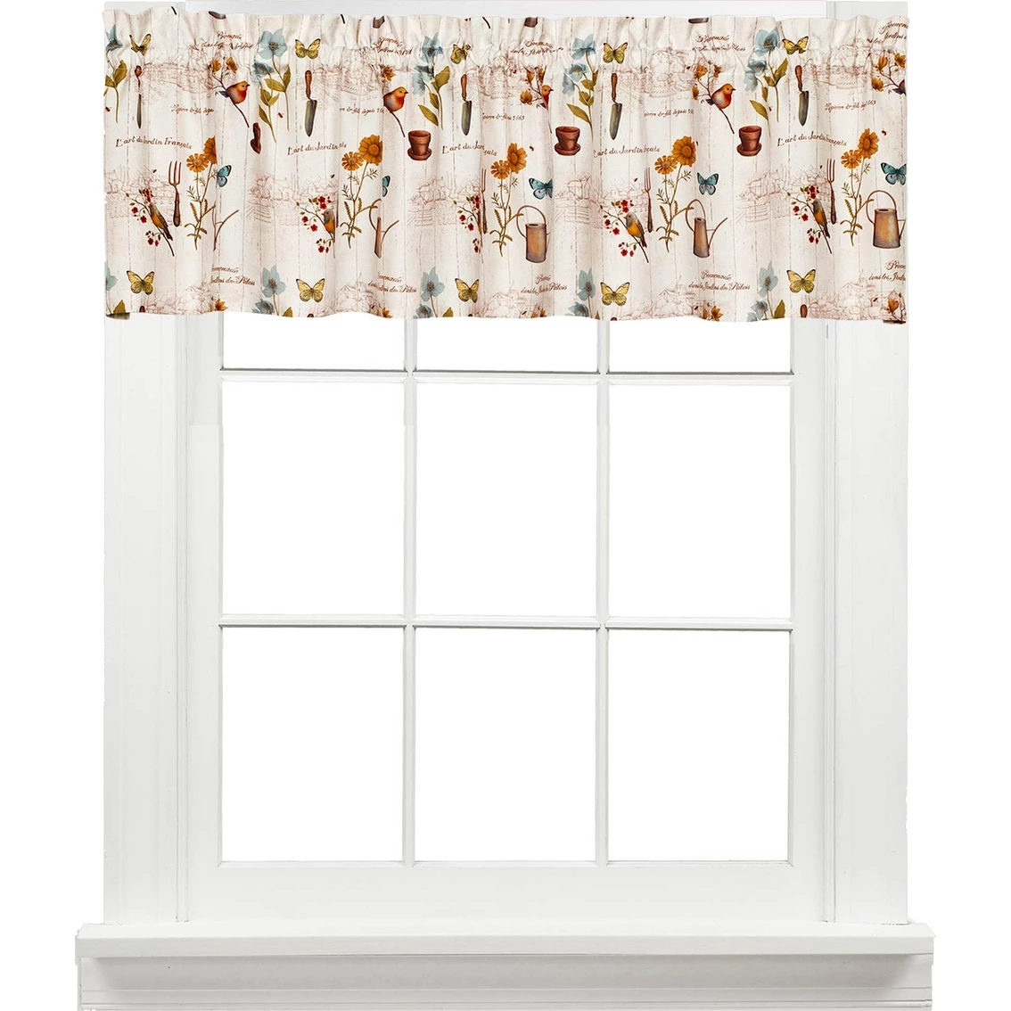 The Saturday Knight Le Jardin Valance is composed of L’art du Jardin Francais subtly depicting a quaint French village scene in the background. Flowers, birds, butterflies and garden tools are in the fore ground accented with French calligraphy. The fabric is soft, easy care 100% polyester that is machine washable and dryable. Valance will fit up to a 1.5 in. diameter rod.