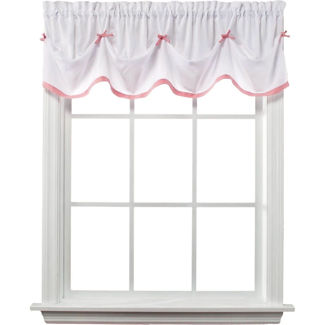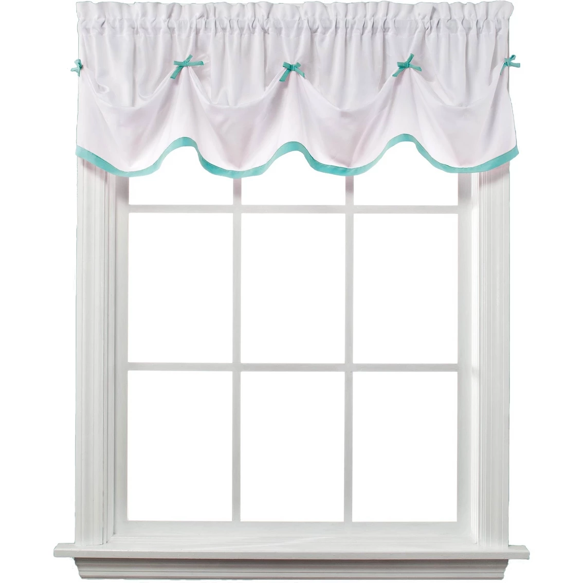Bring a clean, fresh look your room’s decor with this charming Kayla window valance from Saturday Knight. Adorned with a contrast color that traces the naturally drapey fabric as it cascades across your window frame. Decorative bows permanently tack the fabric in place. Easy care polyester. Model: M700.
