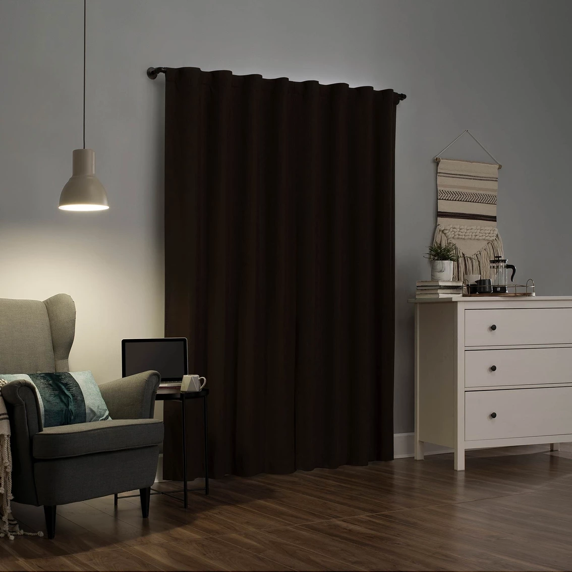 Sun Zero Cyrus Thermal 100% Blackout Back Tab Curtain Panels provide the ultimate in light blocking technology to keep out even the harshest of light while adding energy efficiency to any room of your home. Sun Zero Total Blackout technology is laboratory tested to block out 100% of light, reduce outside noise by up to 30% and decrease energy lost through your windows by up to 30%. Comfort is optimized with thermal insulation that helps keep summer heat and winter chill out of your home. Equipped with hidden back tabs for easy hanging on standard curtain rods up to 1.5 in. in diameter. Hang in your entertainment room to eliminate screen glare and reduce distracting outside noise, or in your bedroom for enhanced privacy and a sounder, more uninterrupted sleep.