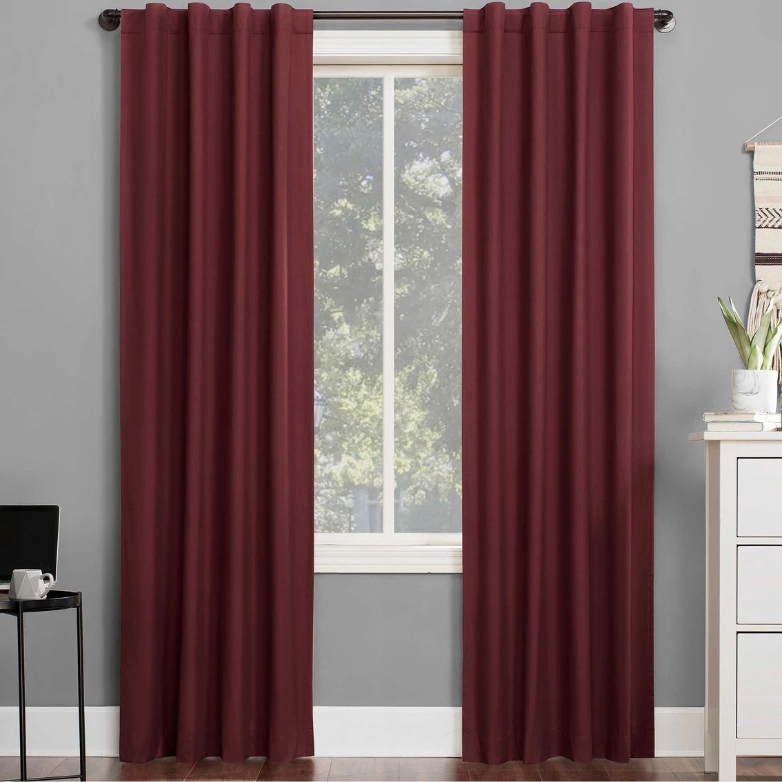 Sun Zero Cyrus Thermal 100% Blackout Back Tab Curtain Panels provide the ultimate in light blocking technology to keep out even the harshest of light while adding energy efficiency to any room of your home. Sun Zero Total Blackout technology is laboratory tested to block out 100% of light, reduce outside noise by up to 30%, and decrease energy lost through your windows by up to 30%. Comfort is optimized with thermal insulation that helps keep summer heat and winter chill out of your home. Equipped with hidden back tabs for easy hanging on standard curtain rods up to 1.5 inches in diameter. Hang in your entertainment room to eliminate screen glare and reduce distracting outside noise, or in your bedroom for enhanced privacy and a sounder, more uninterrupted sleep. Model: 56681.
